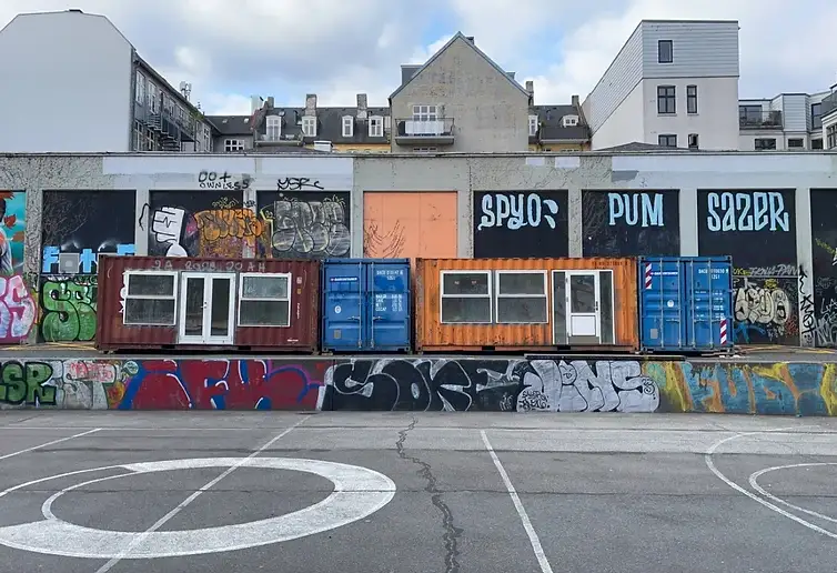 Med de fleste materialer indsamlet startede produktionen i samarbejde med Raunstrup på Søndergaards byggeplads ved Damhusengens Skole, hvor containerne blev klargjort med gipsarbejde og montering af døre og vinduer. Derefter blev de fragtet til Charlotte Aamundsens Plads, hvor sidste del af arbejdet blev udført.